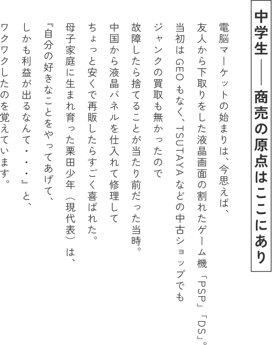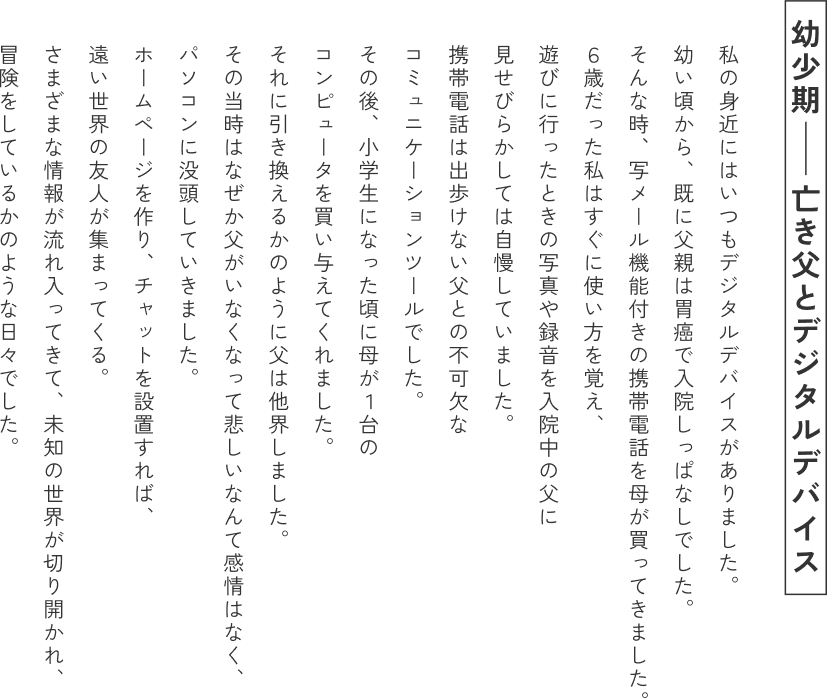 思い返せば、私にとってデジタルデバイスは、人生そのものでした。新しいテクノロジーを使いこなすことができれば、笑顔になる人がいる。頼ってくれる人がいる。相談してくださる方々全員に、「なんとかしてあげたい!」と思う自分がいました。いつの日か、今は亡き父と1台の携帯電話を通して笑い合ったあの日の自分と同じように(詳しくはHISTORYをご参照下さい)、デジタルデバイスを通して幸せな日々を送って欲しい。そんな思いを抱きながら、「あらゆる挑戦の起爆剤となり、日本社会に革命を起こす。」をビジョンに掲げ、電脳マーケットは邁進して参ります。