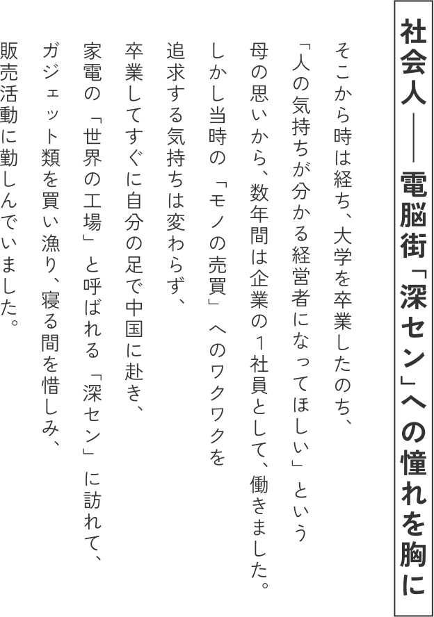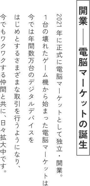 電脳マーケットは、2021年3月1日に設立した中古デジタルデバイス商社です。「電脳」とは中国語でパソコンを意味し、それらが無数に集まるマーケット(市場)という意味を込めて、「電脳マーケット」と名付けました。秋葉原のような電気街は“電脳街”とも呼ばれます。私がかつて訪れた中国・深圳(シンセン)は”アジアのシリコンバレー”と呼ばれ、無数のパーツの卸売店がひしめき合っていました。その規模は秋葉原の30倍にも及ぶといわれています。そのようなワクワクするガジェットが手に入る、そして利便性の高いマーケットを日本でも実現したいという願いを込めています。